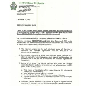 Recall that on December 6, 2022, the CBN ordered Deposit Money Banks (DMOs) and other financial institutions to ensure that weekly over-the-counter (OTC) cash withdrawals by individuals and corporate entities do not exceed N100,000 and N500,000, respectively.